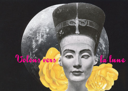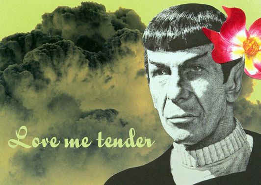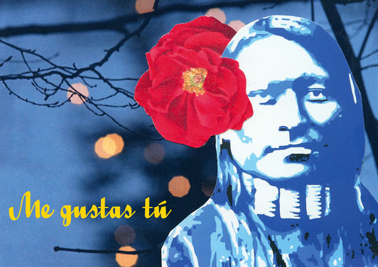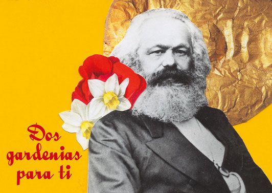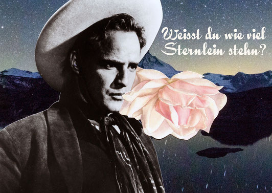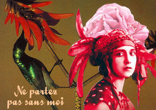 Statt Photoshop kamen Nagelschere, Japanmesser und Leim zum Einsatz. So entstanden aus Werbematerial, Schwarzweissfotos und Ausschnitten aus einem alten Rosenbuch Collagen.